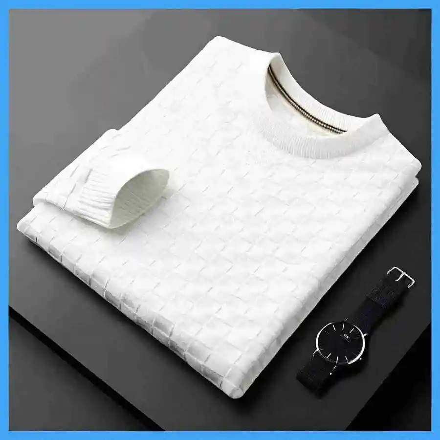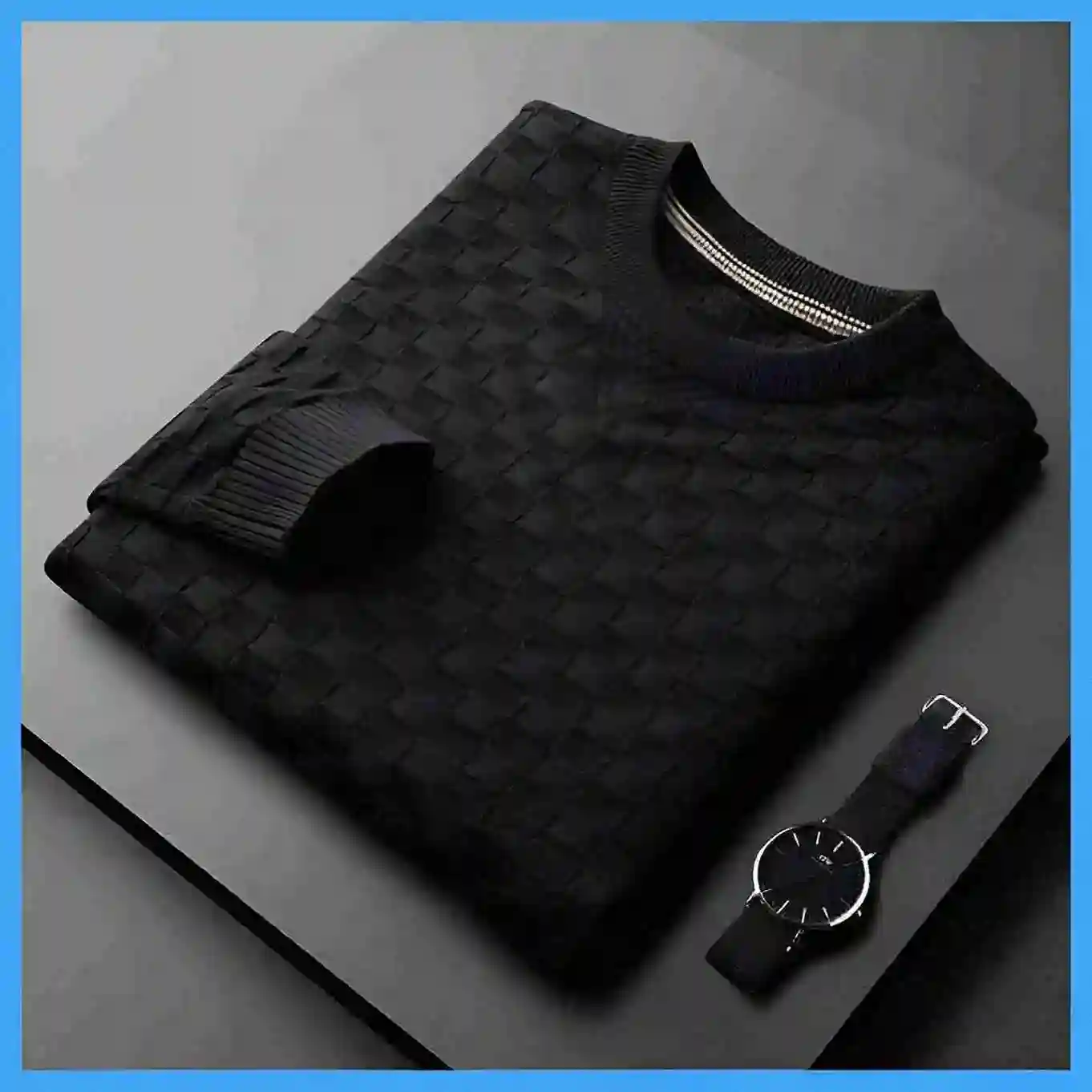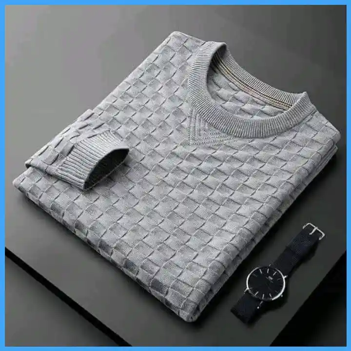 بلوفر رجالي شتوي بتصميم نقش مربعات عصري، خامة ليكرا مريحة ومرنة، مقاس واحد يناسب من 55 حتى 95 كيلو. مناسب للخروجات واللبس اليومي.