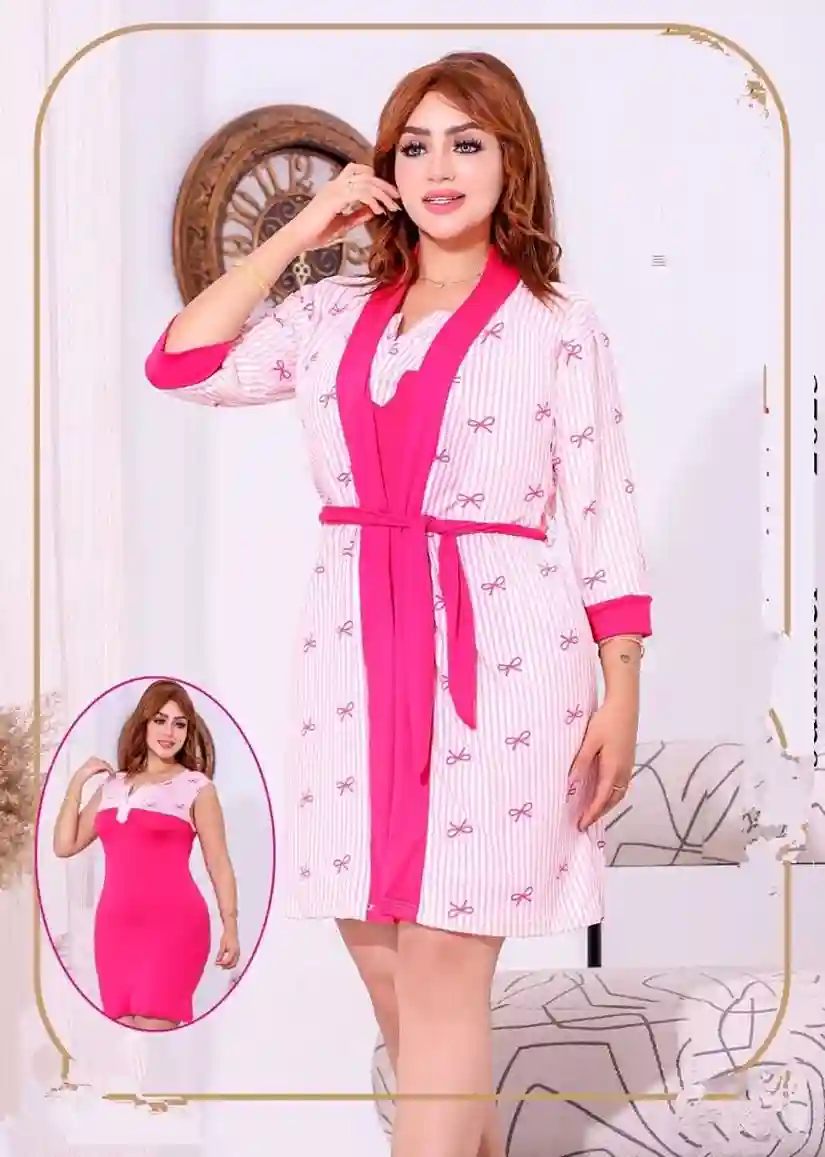 استمتعي بالراحة والأناقة مع طقم الروب الفيونكة الرائع المكون من قطعتين، مصنوع من خامة ناعمة ومرنة بنسبة 85% قطن، ليمنحك إحساسًا مميزًا بالراحة طوال اليوم، خاصة في الأجواء الحارة.